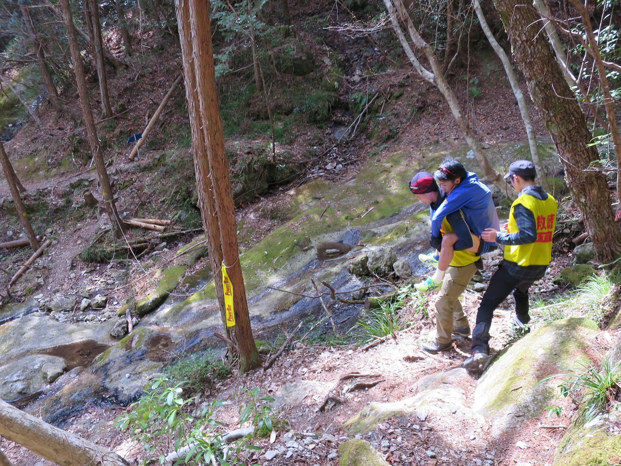11Kのレース中に6.4km地点の山中にて足部骨折疑いの選手は白くま隊にテーピング固定後、地元消防士さんに背負われて下山していきました。