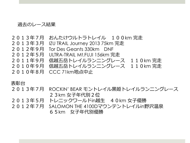 わたしの走力は、マイナーなショートレースで何度か表彰台に上ったことがありますが、ロングだと、信越、おんたけ、UTMFなどを完走しているくらいです。