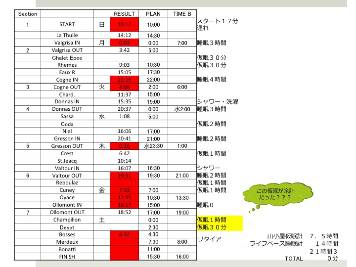 睡眠時間は、トータル21時間30分でした。1日4時間くらいです。20時間も寝たのか!という感じですし、最終セクションで呑気に仮眠を取っている場合じゃないように見えます。