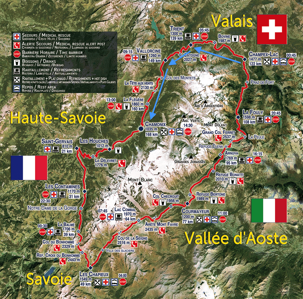 は本当だった。何が辛かったんだろうと思うが、UTMBは登りの距離がとにかく長かった。登っても登っても山頂に着かないのだ。また、平均標高も高いので自分が思っている以上に身体への負荷が高く、いつの間にか体力が削られている感じだった。特に前半の何でも無い緩いトレイルなのに(1)で書いた異常な心拍の上がり具合は今思えばヤバい状態だった。そして、日本の山のように森の中を進む区間が少なく、強い日差しが体力をジワジワと奪っていく。これが過去の大会ように雪が降ると今度は寒さで体力が削られる。暑くても寒くてもどちらにせよ、めまぐるしく変わる環境の変化の振り幅が日本の大会より大きい。国内のレースでさえ万全の体調で望むのが難しいのに、慣れない海外遠征で時差ボケも加わり、数日間で自分の体調を整えてUTMFより辛い100マイルレースをスタートしなければならないのだ。タイムはどうであれ、それら万難を排して完走した人は本当に凄いと思う。そして、完走できなかった事は全く恥ずべき事ではない。それくらい厳しいレースだと思う。