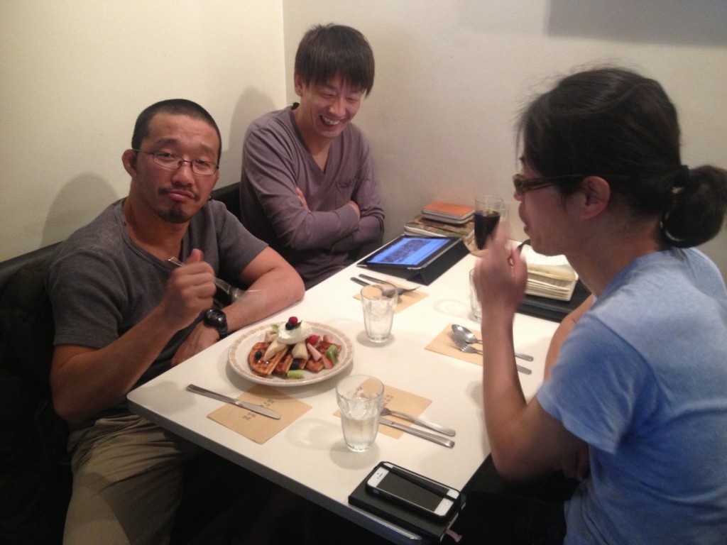 「MTGしている感じを下さい。」とやらせ写真の指示をしたのですが、左側の方がカメラ目線だったために台無しになりました。ちなみに手前のお皿はフルーツワッフル。傭兵みたいな外見の中身は完全にOLということも判明しました。