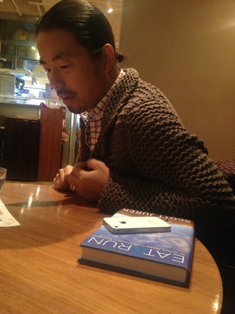勘のいい方なら前回のポストの時点でお気づきになられたとは思いますが、ある方とは日本版『BORN TO RUN』の編集者でおなじみの編集者松島倫明さんです。『BORN TO RUN』だけではなく『フリー』『シェア』『パブリック』『メイカーズ』等世の中に影響を与える数々のヒット作を手がけて来た松島さんが次に出版するのが、トレイルランニング界のリビングレジェンド、スコット・ジュレックの著作『EAT & RUN』で、松島さんも最近ヴィーガニズムを生活に取り入れていることから、ドミンゴが松島さんに今回のイベントのコラボレーションを提案、氏に快諾頂いたことから打ち合わせという運びとなりました。ちなみに松島さんもトレイル鳥羽ちゃんに最近加入した新メンバーでありw、僕とはAre you BORN TO RUNというランと人生を語るトークイベントを一緒に開催する間柄でもあります。