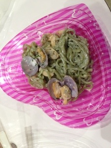 健康パスタは美味。おまけで貰ったオレンジも美味。さらにタレ付け唐揚げもパクパク。