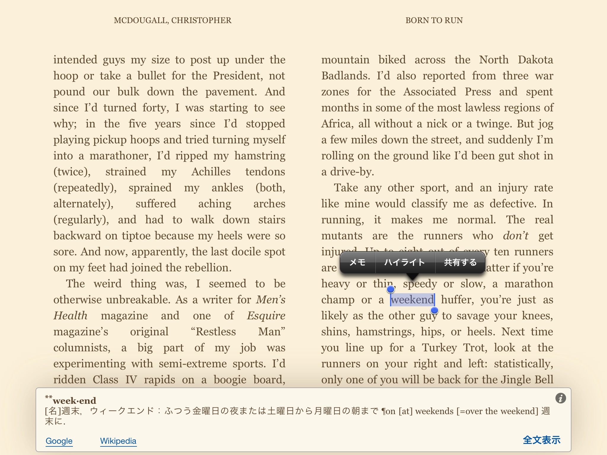 そんな訳でipadのkindleアプリでBORN to RUN(英語版)を読み始めます。で、その機能にビツクリしました。