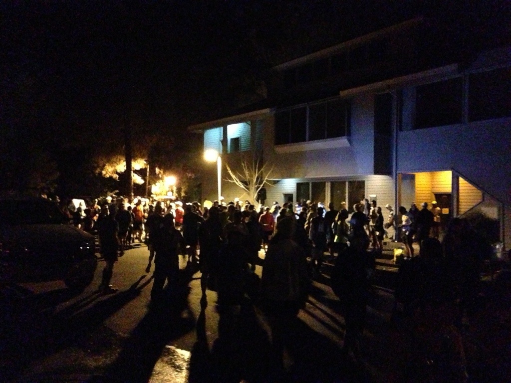 暗闇の中土手の下の方に見える道をランナーが走って来た。さすがジョギング大国と思ったら先頭ランナーの折り返しだった。