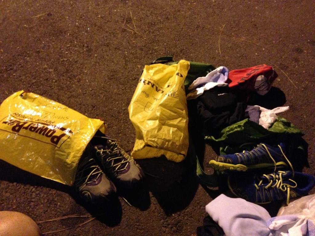 足の痛みを受けて2つ目のドロップバッグにいれていたフカフカMAXのスポルティバのクアンタムを1つ目のドロップバッグに移す。結局これに救われる。