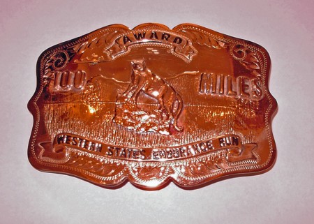 トレイルランにしては珍しい上りが18,000 feet(5400m) 下りは23,000feet(6900m) という下りが多いプロフィールですが元々は馬を走らせるレースの行われていたコース。これに自分の足で参加してしまった若者がいたというのがWSERの始まりで、制限時間は30時間。完走者にはバックルが与えられ、24時間以内での完走者に与えられるシルバーバックルは憧れのものです。制限時間内完走者はブロンズバックル、そして優勝者にはブロンズのcougerトロフィーが送られます。