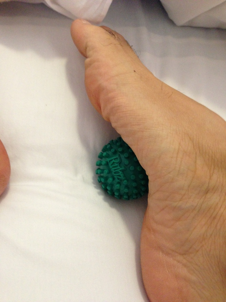 どうだい?本家世界の車窓からにも負けないどうでもよさ。何も起きないって平和だね。平和だからRun Boy!Run Girl!のナンバー1の売れっ子、ボツボツグリーンボールでほぐしている僕の脚の写真でさよならだ。