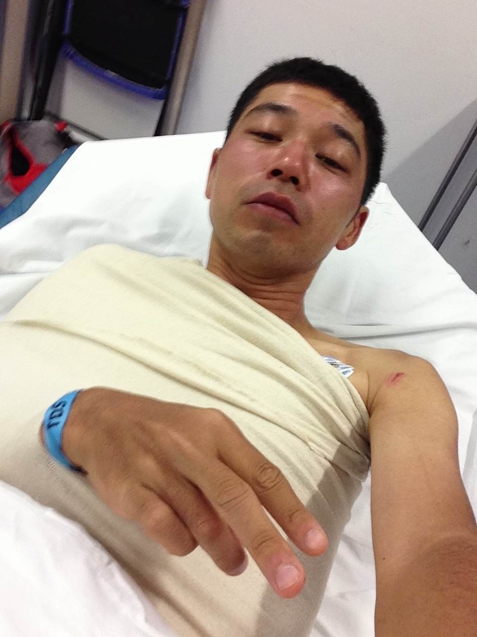 何とか体を起こすが立ち上がれない。右半身の痛みが酷い。肩を触ると外れて前に出ている。肘も向きが変わっている。
