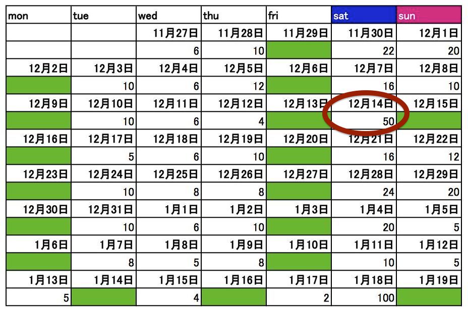 1月18日のレースに向けて日付をつけるとこんな感じ。表示は「マイル」、緑は休日。