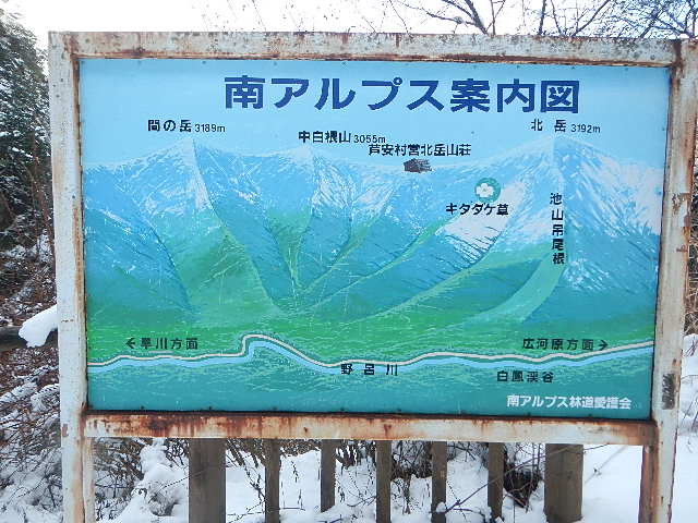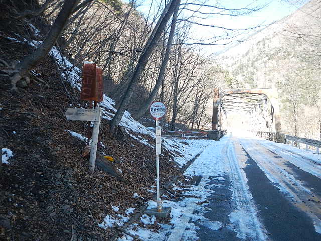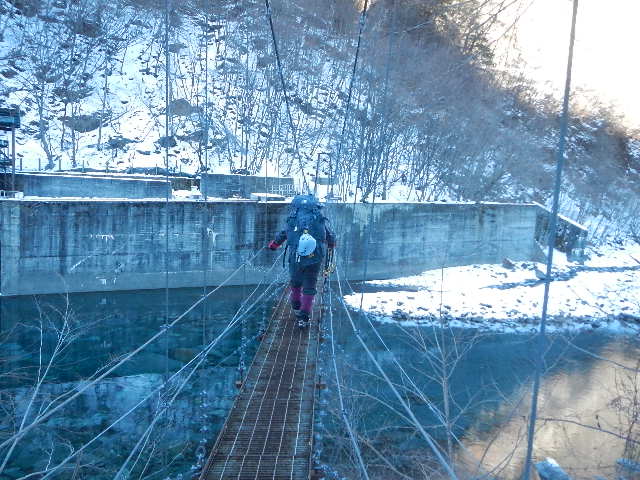 アイゼンを付けたまま吊橋を渡った後、少し登り返して奈良田からの林道へ合流。アイゼンをはずしてから「あるき沢橋」という橋のたもとの登山口までのんびり歩き、いよいよ急登の始まりです。