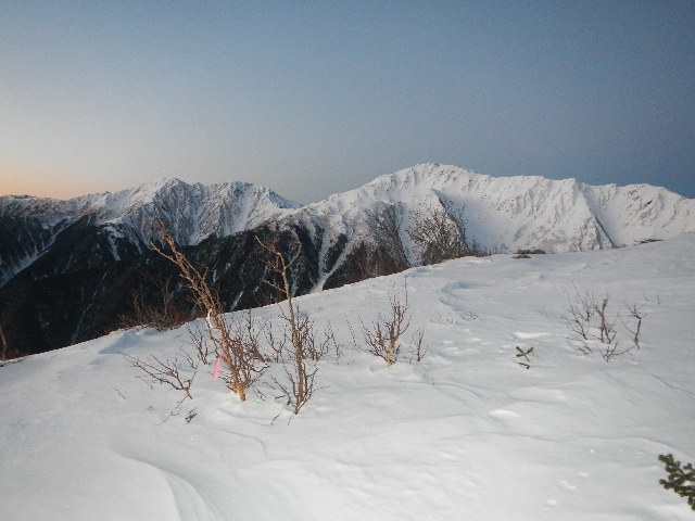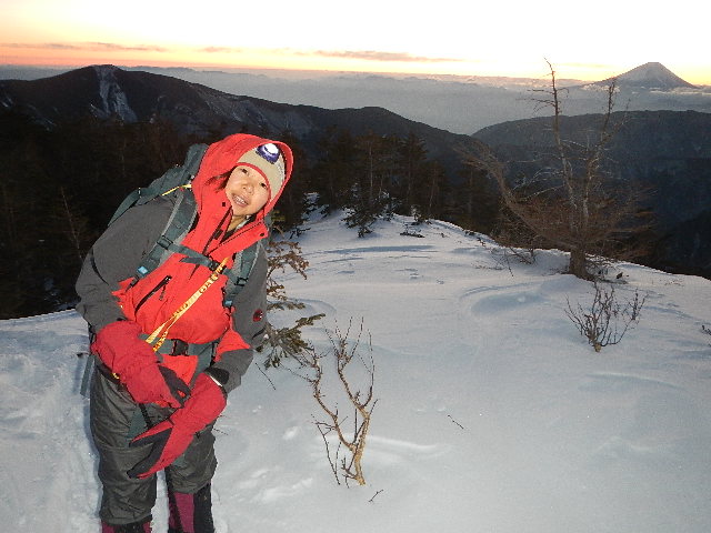5時にヘッドランプを点けながら出発。すぐに猛烈な急登! 汗をかかないように進んでも汗をかいてしまいます。温度調整でジャケット全開で登ります。 雪はパウダーで一歩進んで半歩下がる状態。膝程度のラッセルが続きます。 やがて標高も上がり稜線に出るころに明るくなってきました。