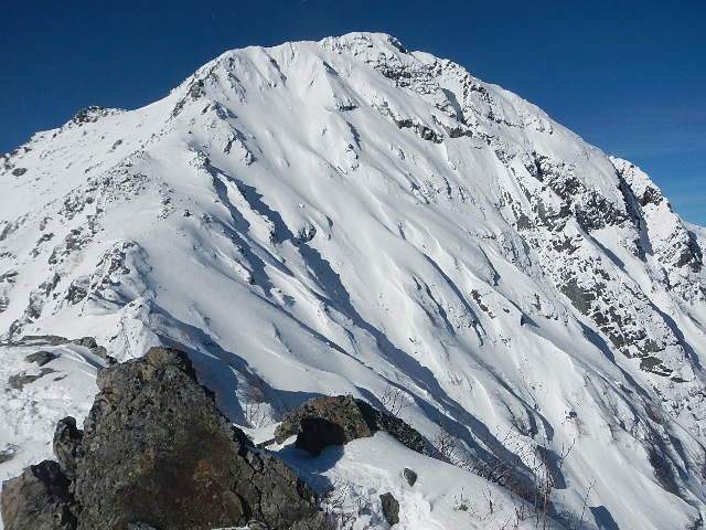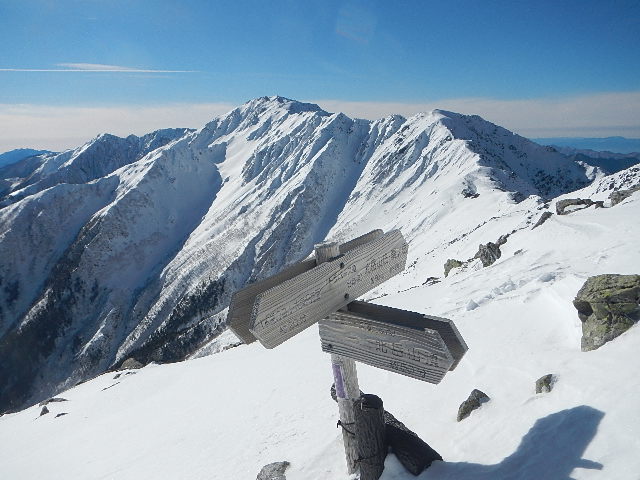 八本歯のコルからは山頂へ向けて登ります。途中でガチガチに凍った急な斜面を何度もトラバースしながら高度を稼ぎ、最後の岩の稜線を登り切ったら山頂がありました。