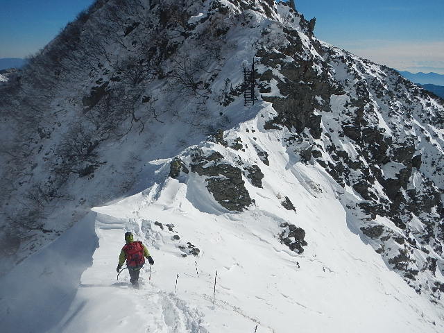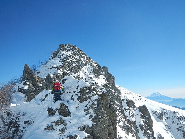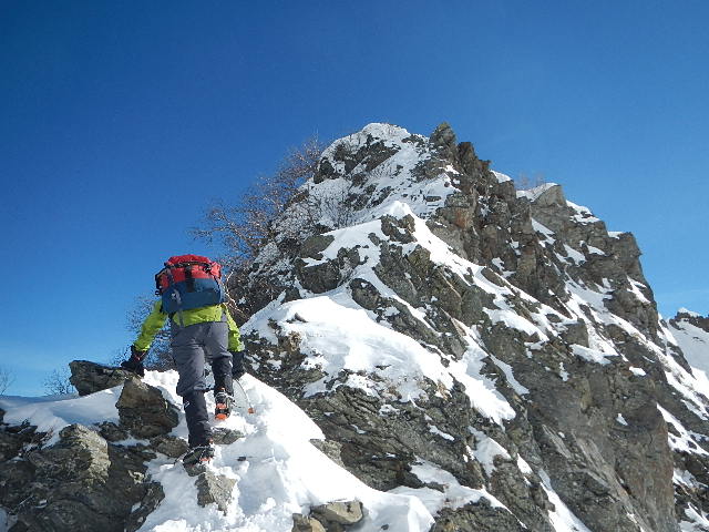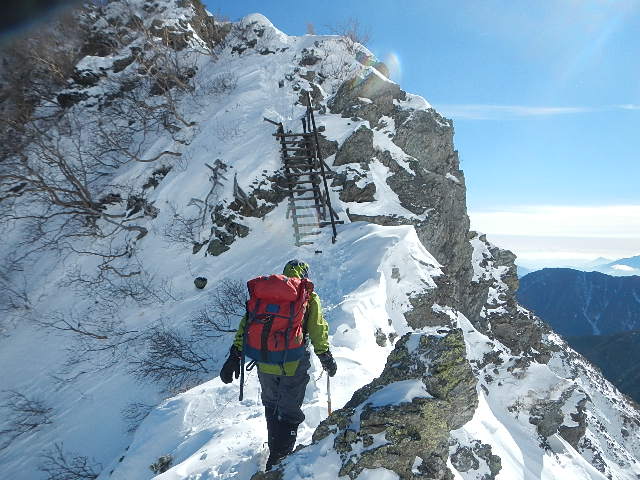 下りきったところからは今度は登り返します。往路はここをクライムダウンして下りてきたのですが、ちょうど良いホールド(岩を掴める場所)をピッケルのブレードで雪から掘り出しながらでした。スタンス(足場)の悪いところはアイゼンの前爪を岩に置きながら下りたり登ったり・・・