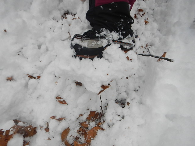 そしてこの鷲ノ住山の稜線が、一部だけ実はちょっと・・・ うっすら積もった雪が氷化してツルツル。土もガチガチ。 樹林帯だけど結構な角度で両側がスッパリ切れ落ちていて、こんな大荷物背負ってスリップしたらまず助かりません。 即アイゼン装着です。