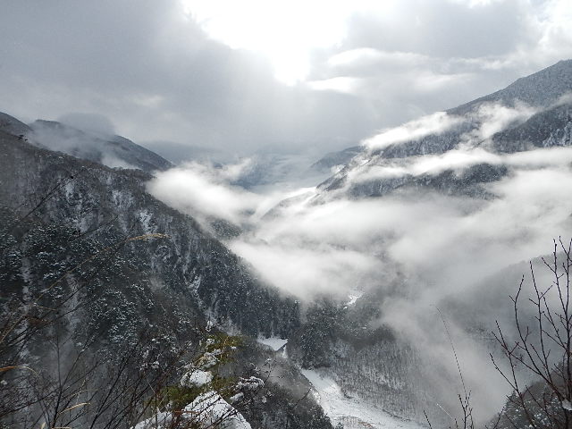 この頃には雪も止んでいたので私だったら消耗を防ぐために登りではジャケットを脱いで進むと思います。 その後、奈良田へ続く林道を下っていくと更に一人の男性とすれ違いました。