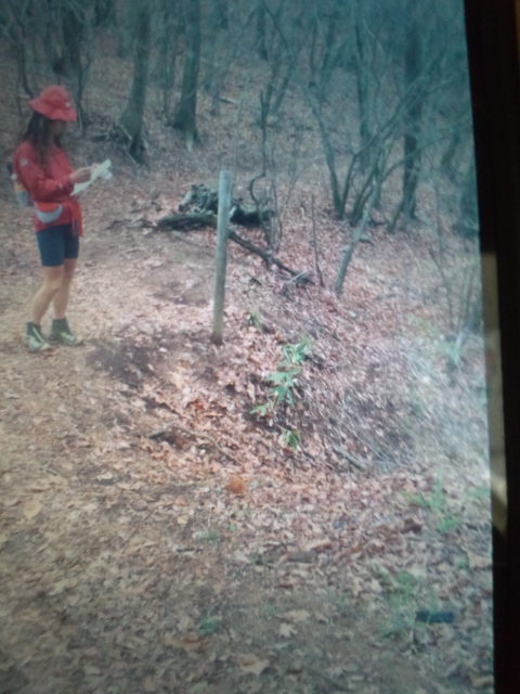 下りきってロードへ出てしまう少し前に、トレイル右側に丸太の棒が打ち込んであります。