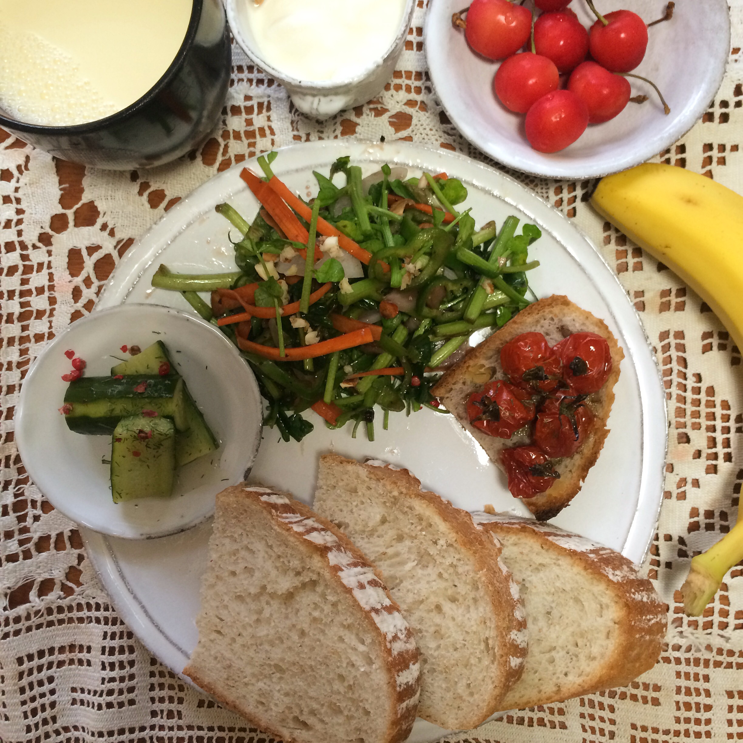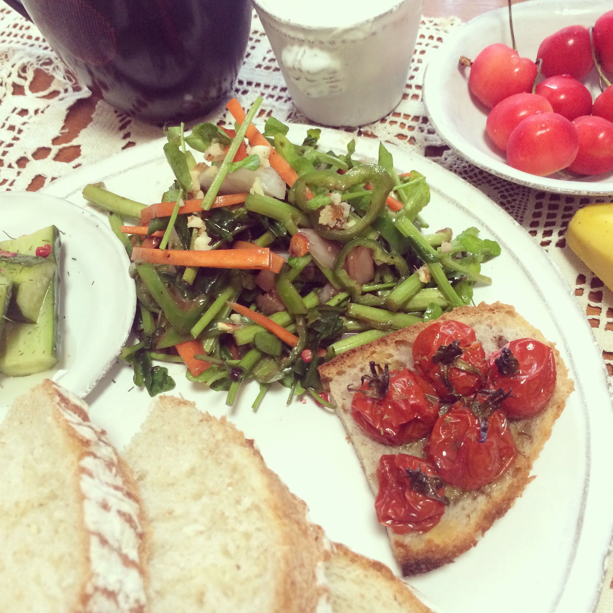 クレソンとカブと人参とタマネギのピクルスと、アーモンドのバルサミコとブルーベリージャムのサラダとキュウリのピクルス〜