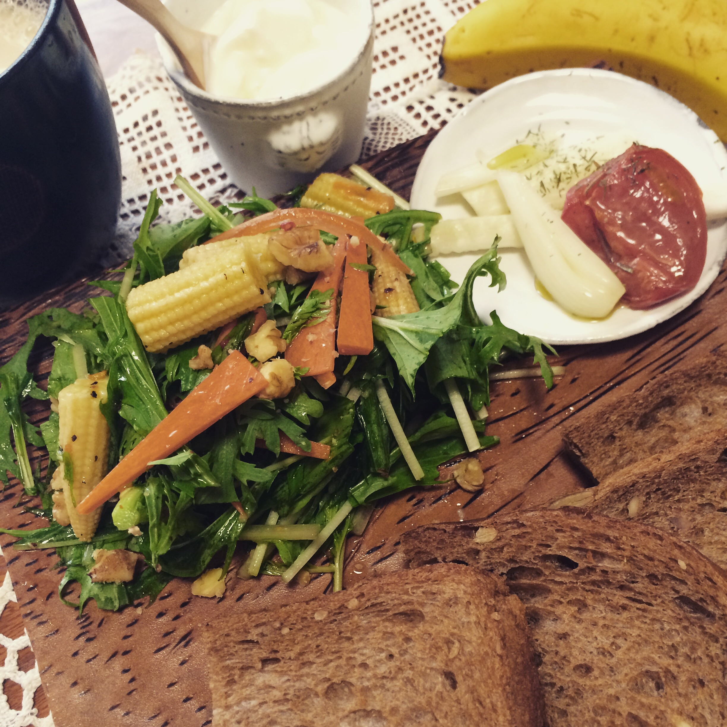 imageベビーコーンと水菜と春菊とタマネギのピクルスのチリとクミンのサラダとエシャロットとトマトのマリネ~