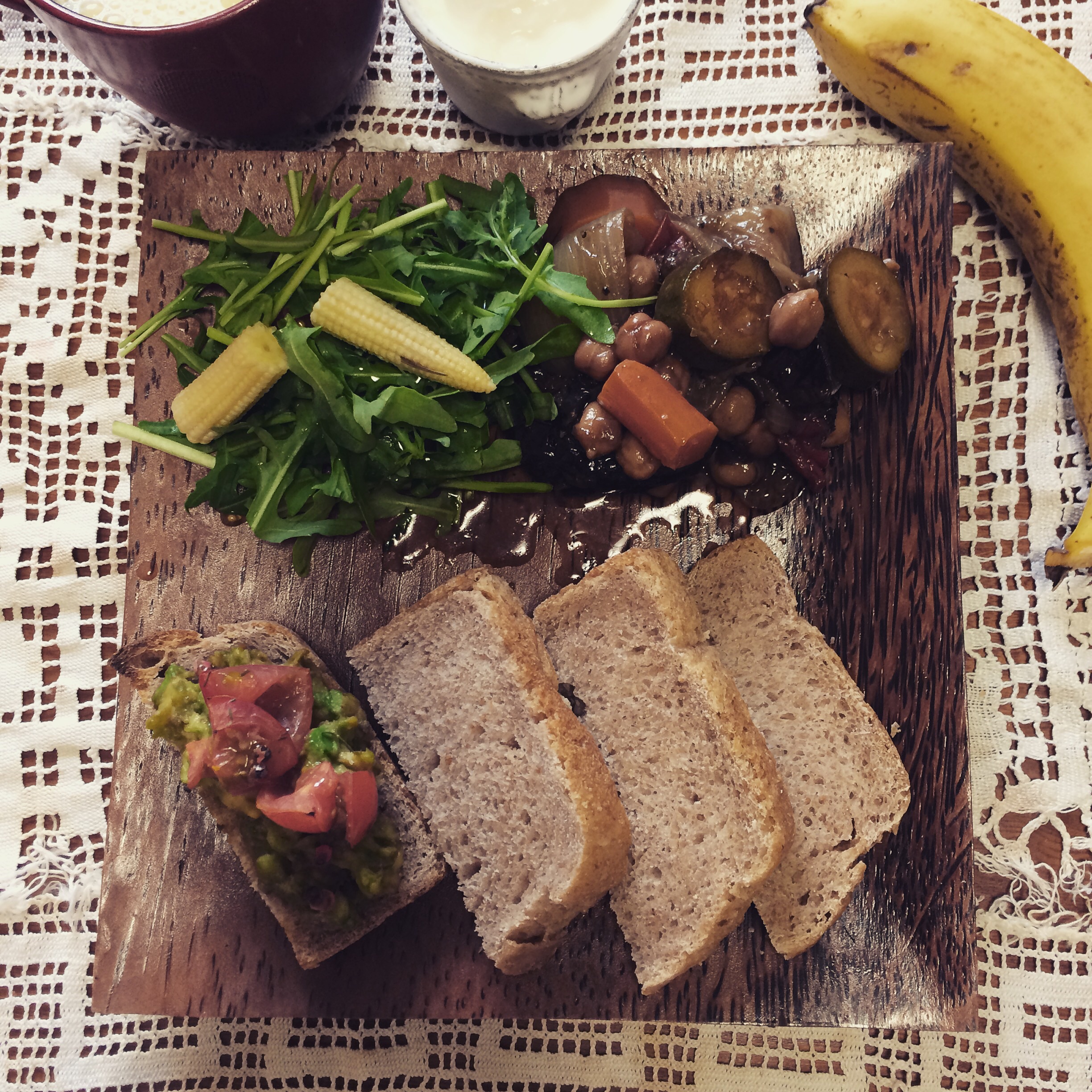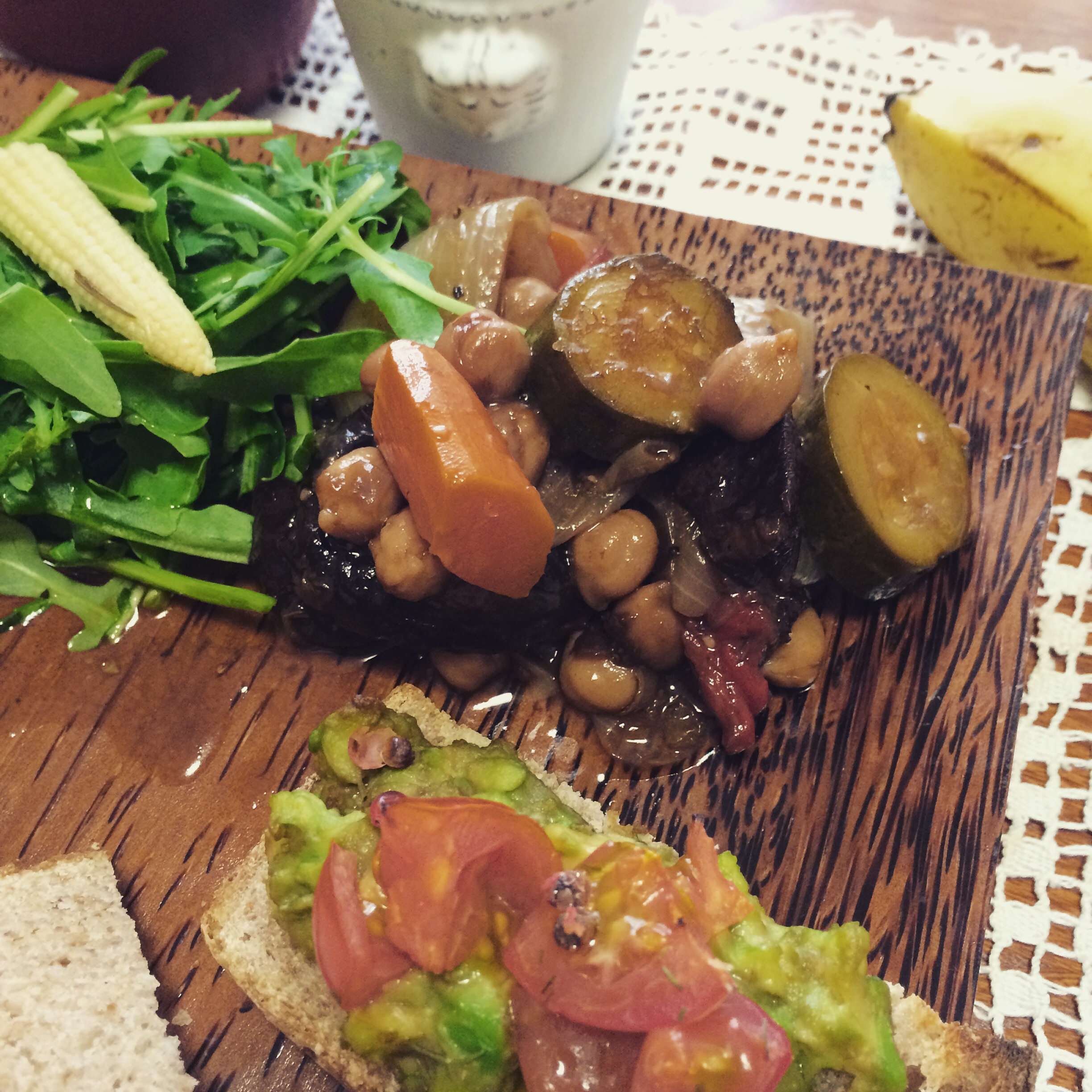 imageひよこ豆と夏野菜のプルーン煮とアボカドとトマトのタルティーヌとルッコラとベビーコーンのマリネサラダ