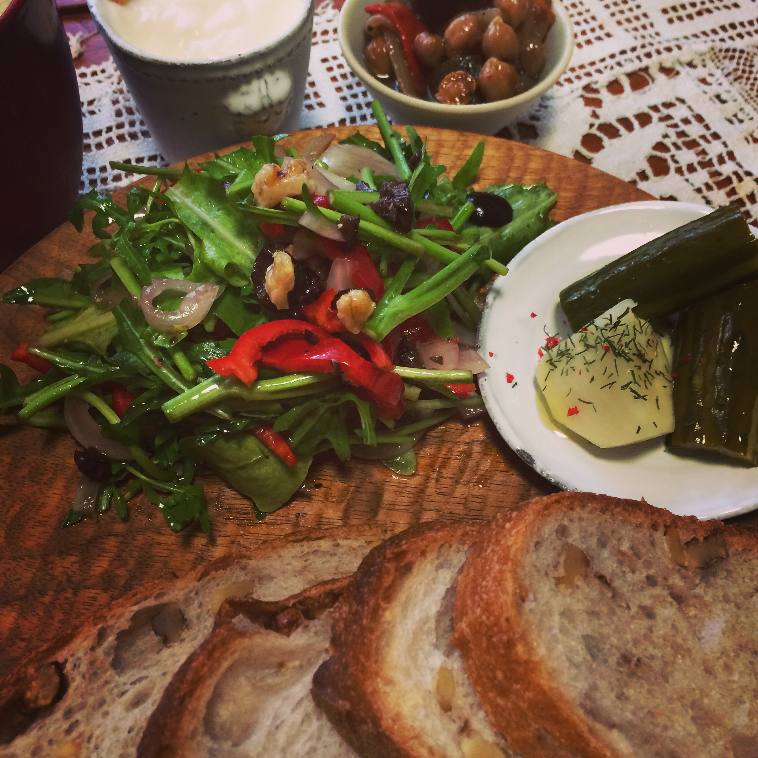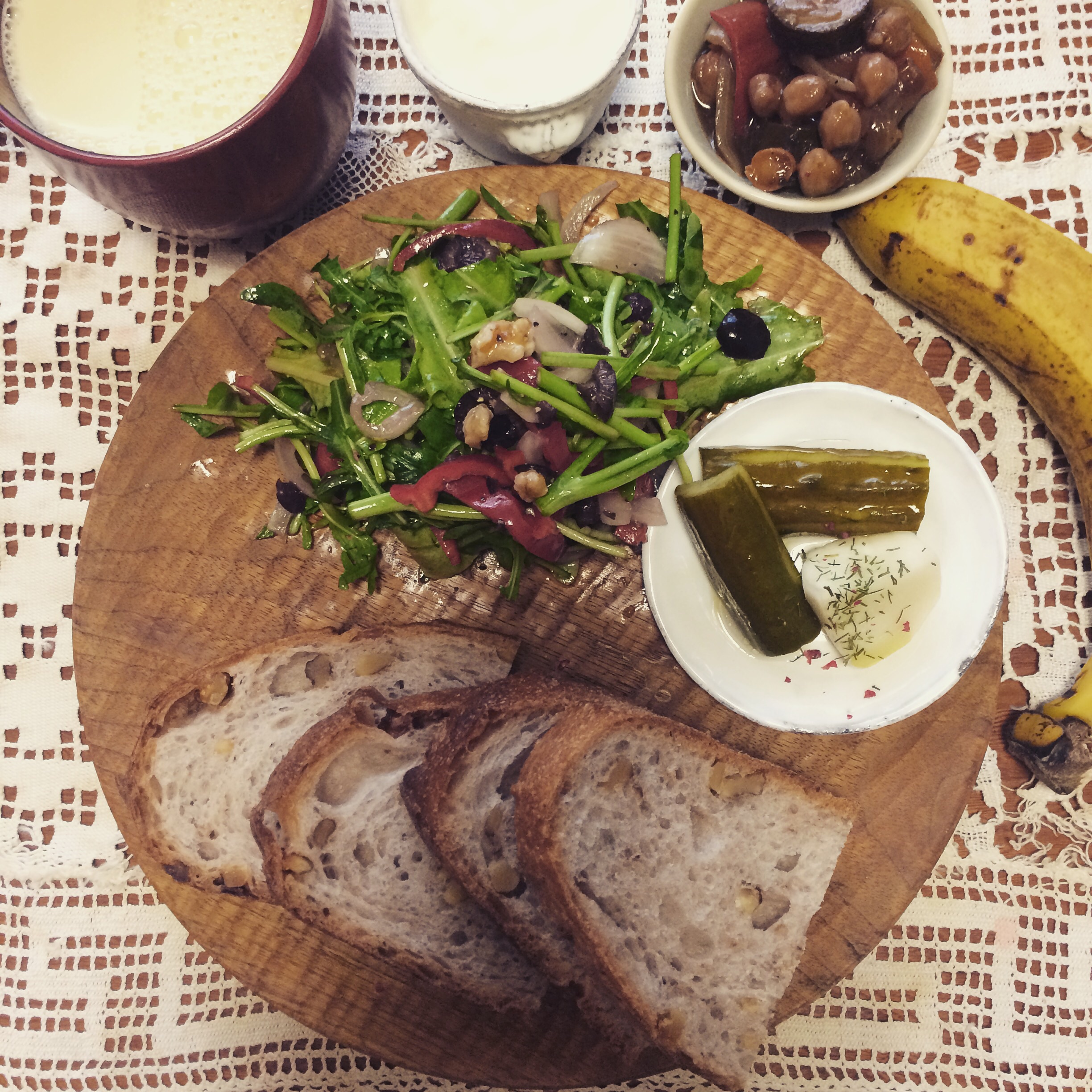 ルッコラと赤ピーマンとタマネギのピクルスと胡桃のブラックオリーブとブルーベリージャムのサラダとカブときゅうりのピクルスと夏野菜のプルーン煮(昨日の残りw)
