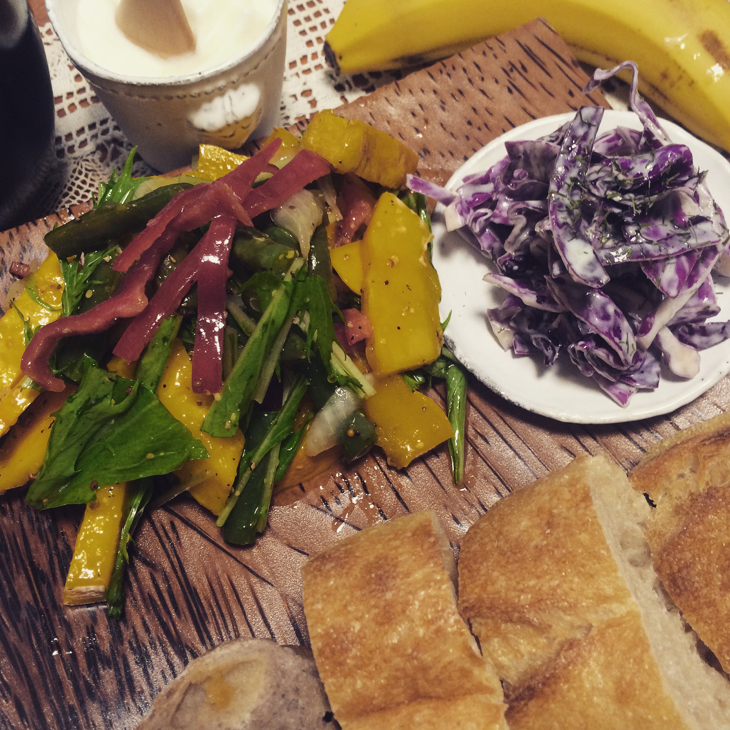 imageコリンキーと赤ピーマンとインゲンと水菜のタマネギとマーマレードのサラダと紫キャベツのヨーグルトのコールスロー