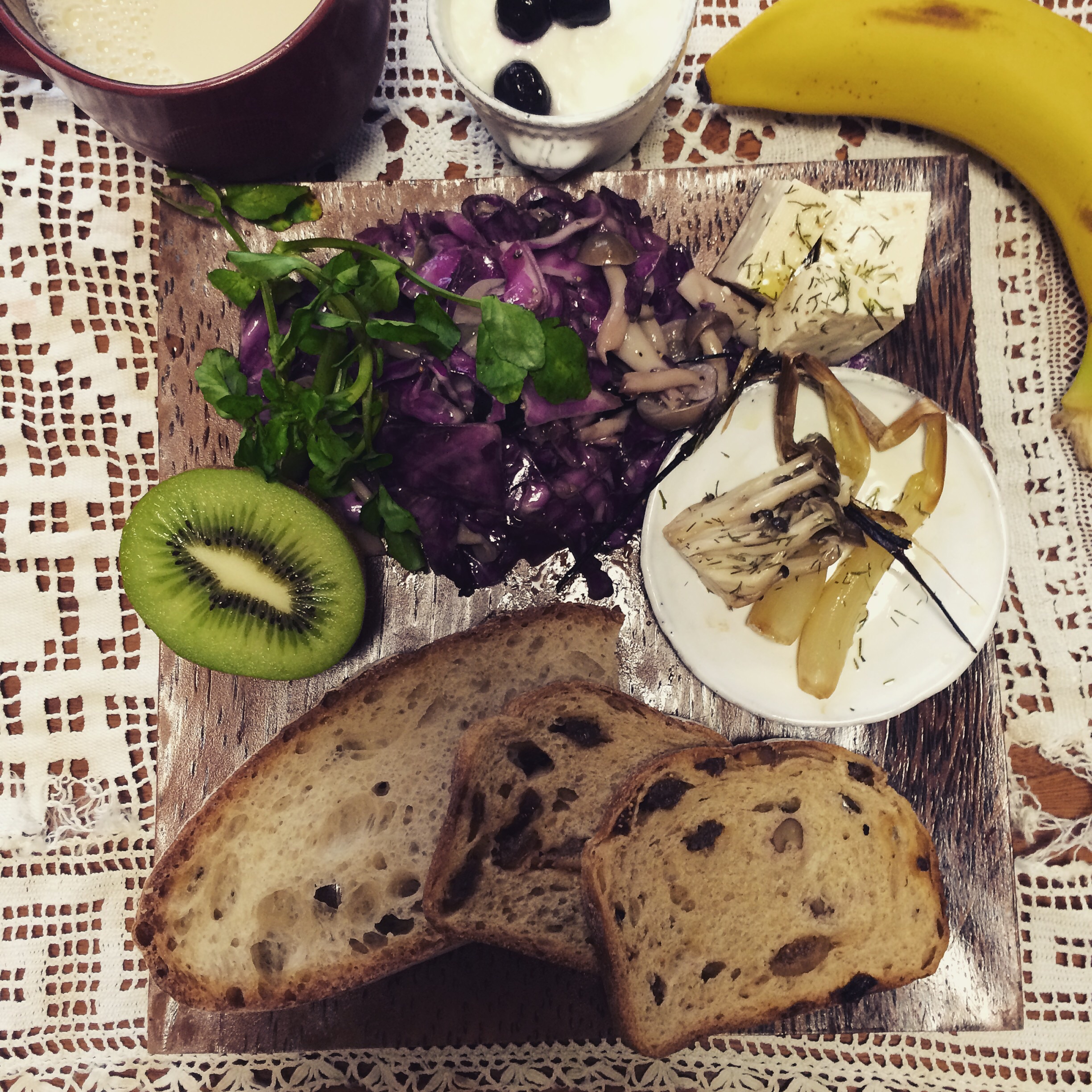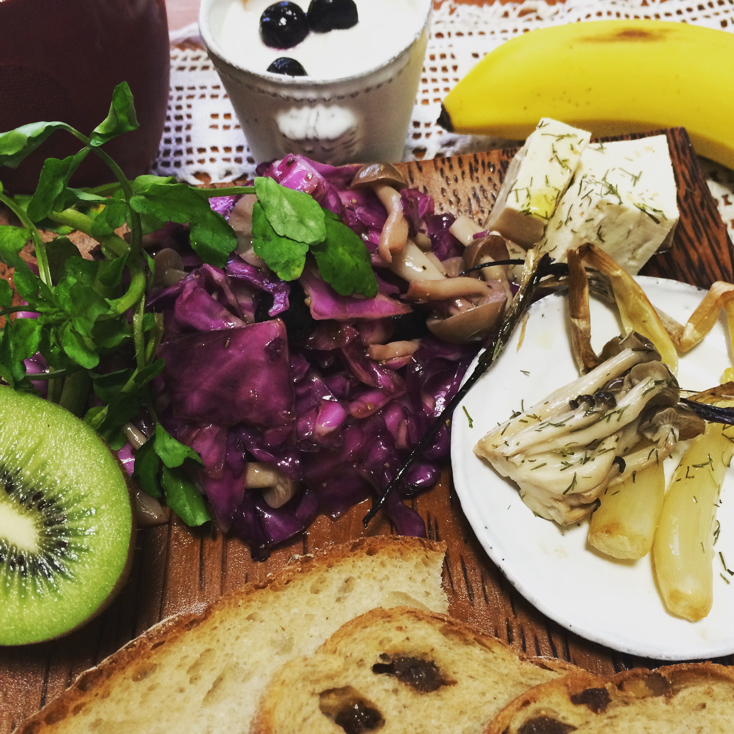 紫キャベツとシメジとクレソンとイタリアンパセリのブラックオリーブとバルサミコのサラダとエシャロットとシメジのマリネと豆腐のマリネ〜〜