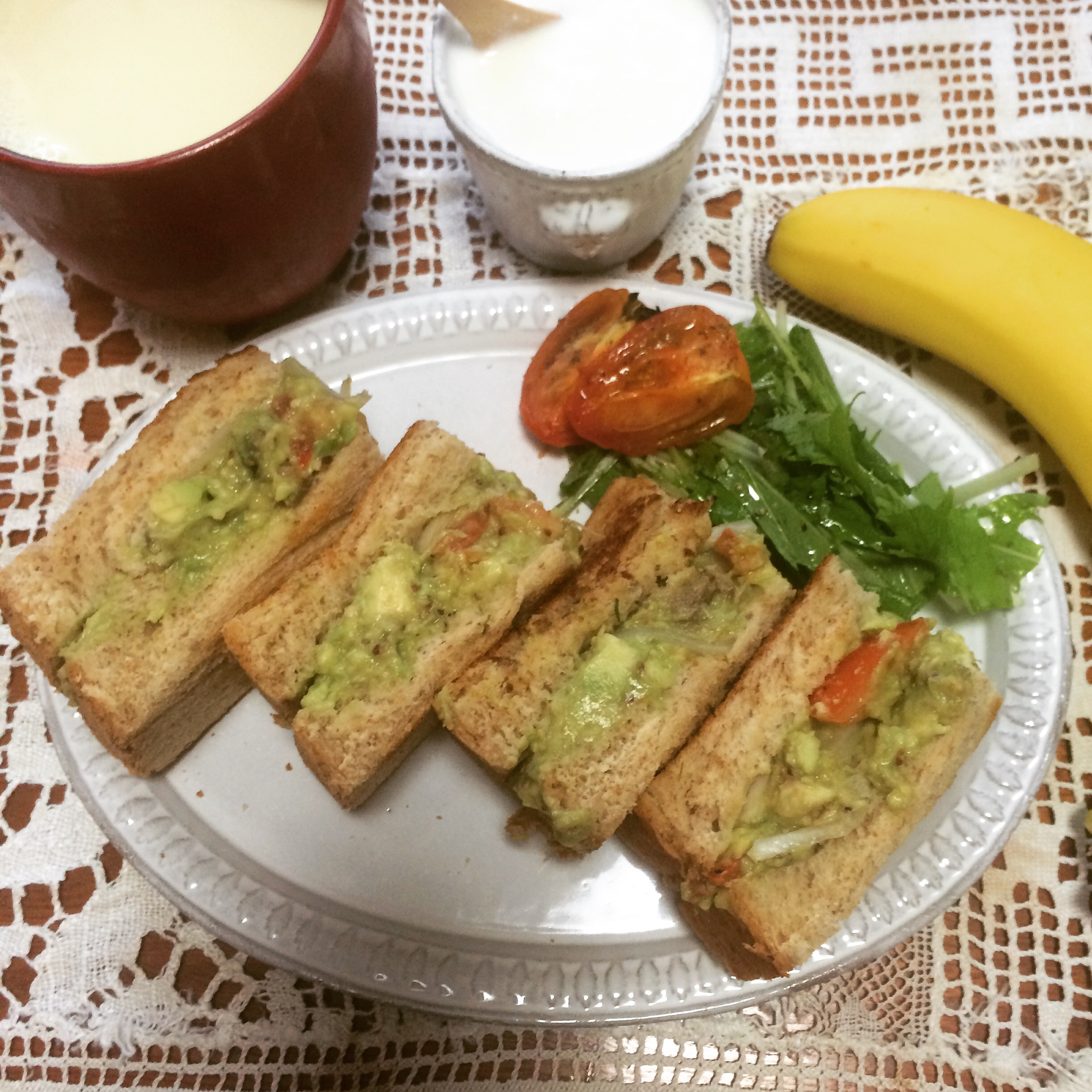 アボカドとトマトとタマネギのピクルスのサンドイッチと水菜のサラダとトマトマリネ〜