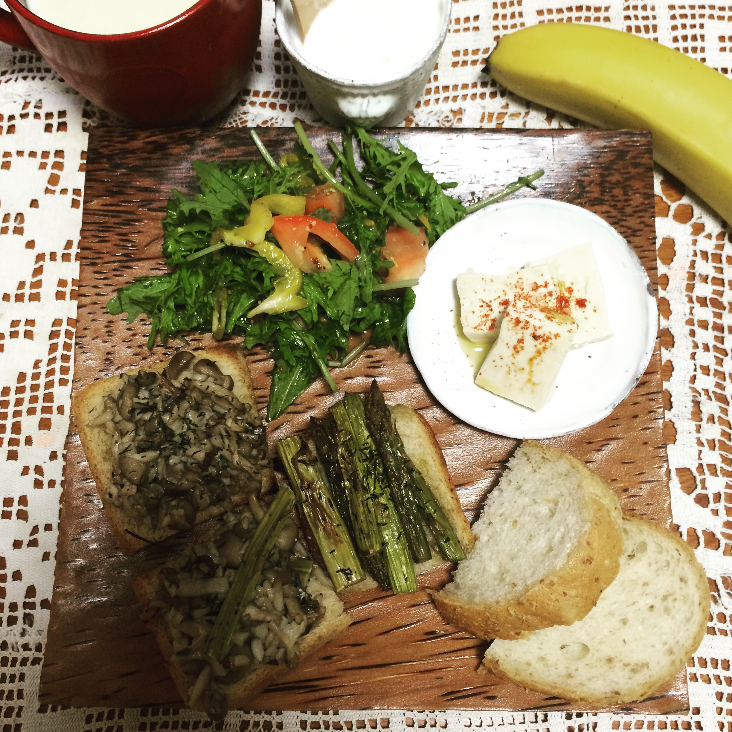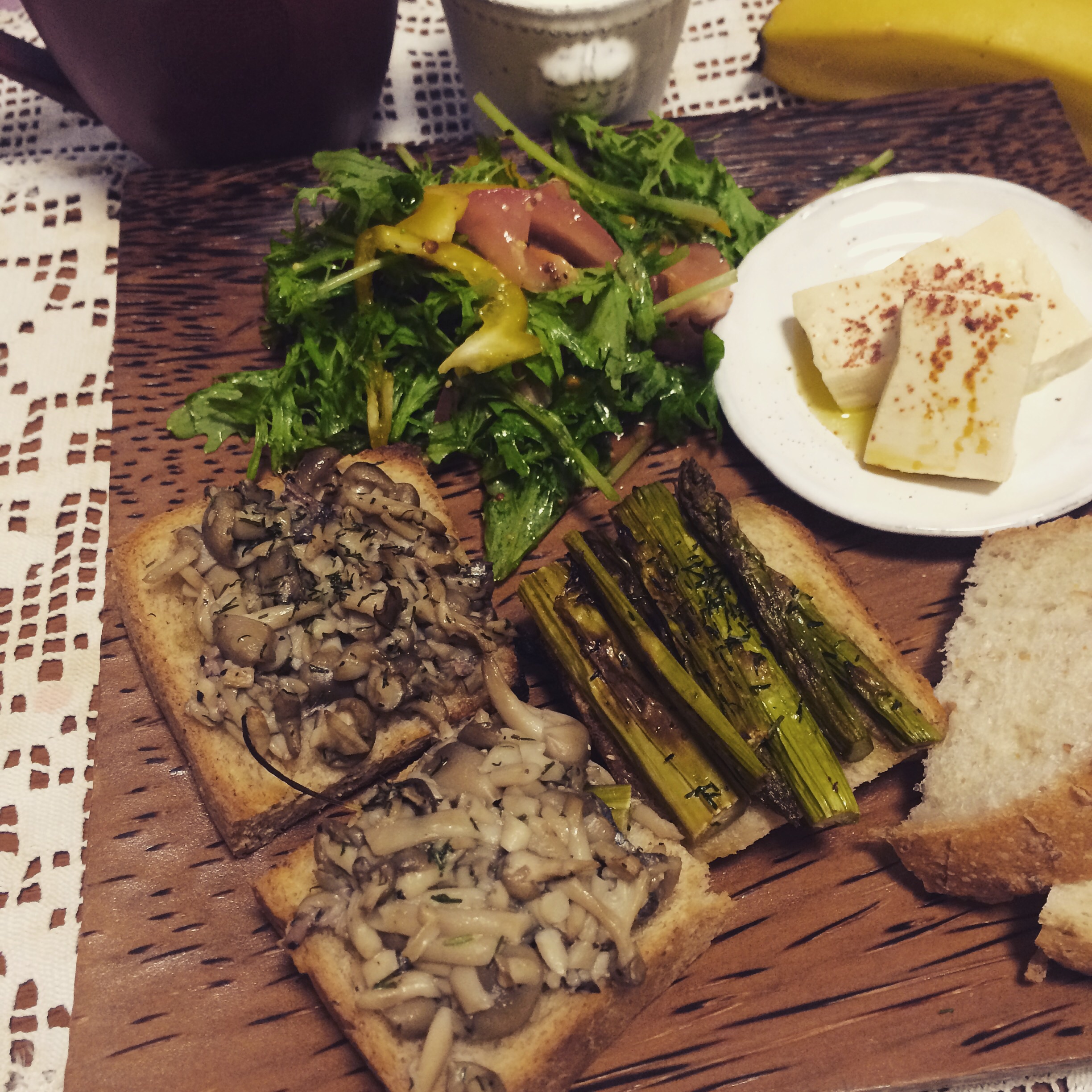 キノコとアンチョビとアスパラのタルティーヌとマスタードサラダのパプリカとトマトの粒マスタードのサラダと豆腐のマリネ〜