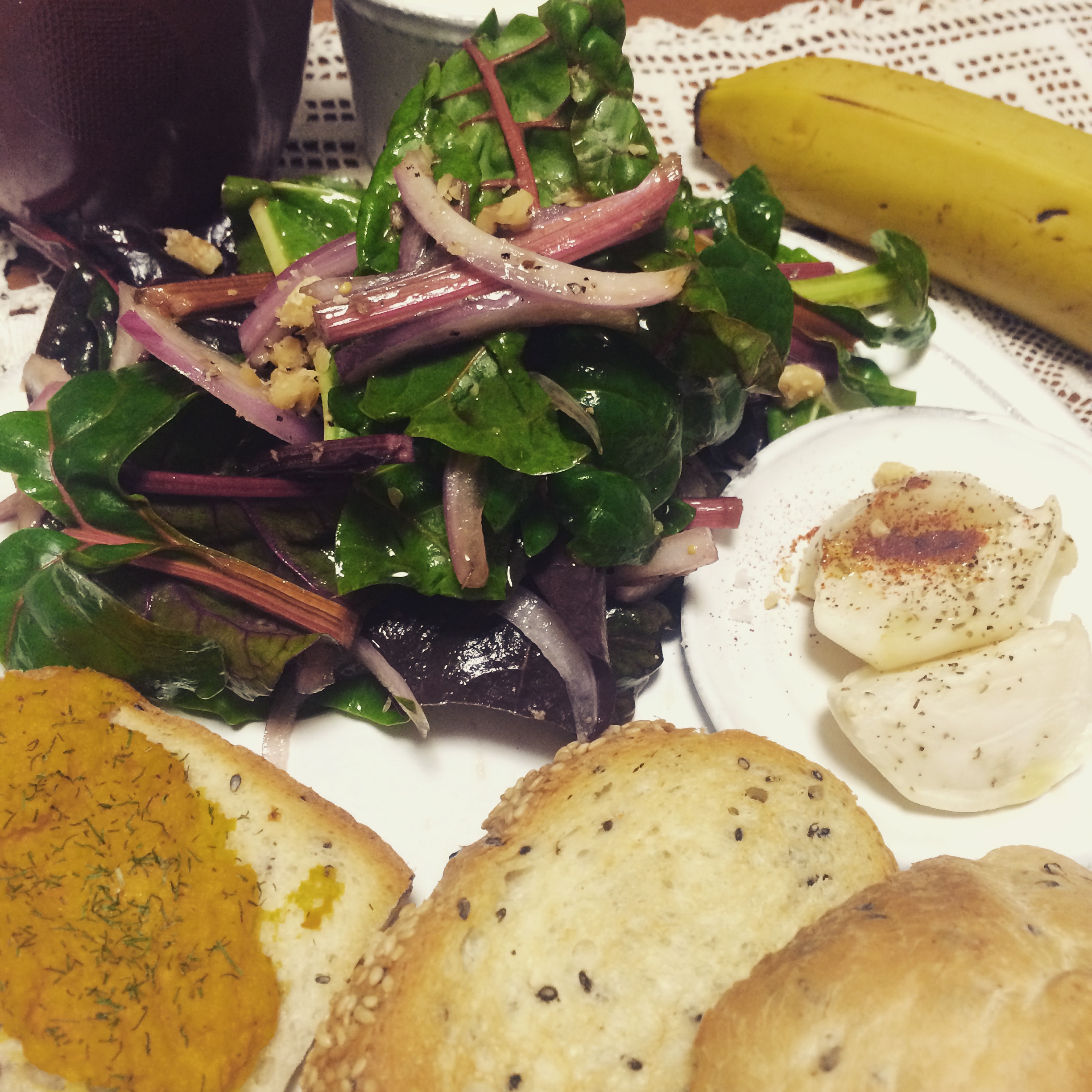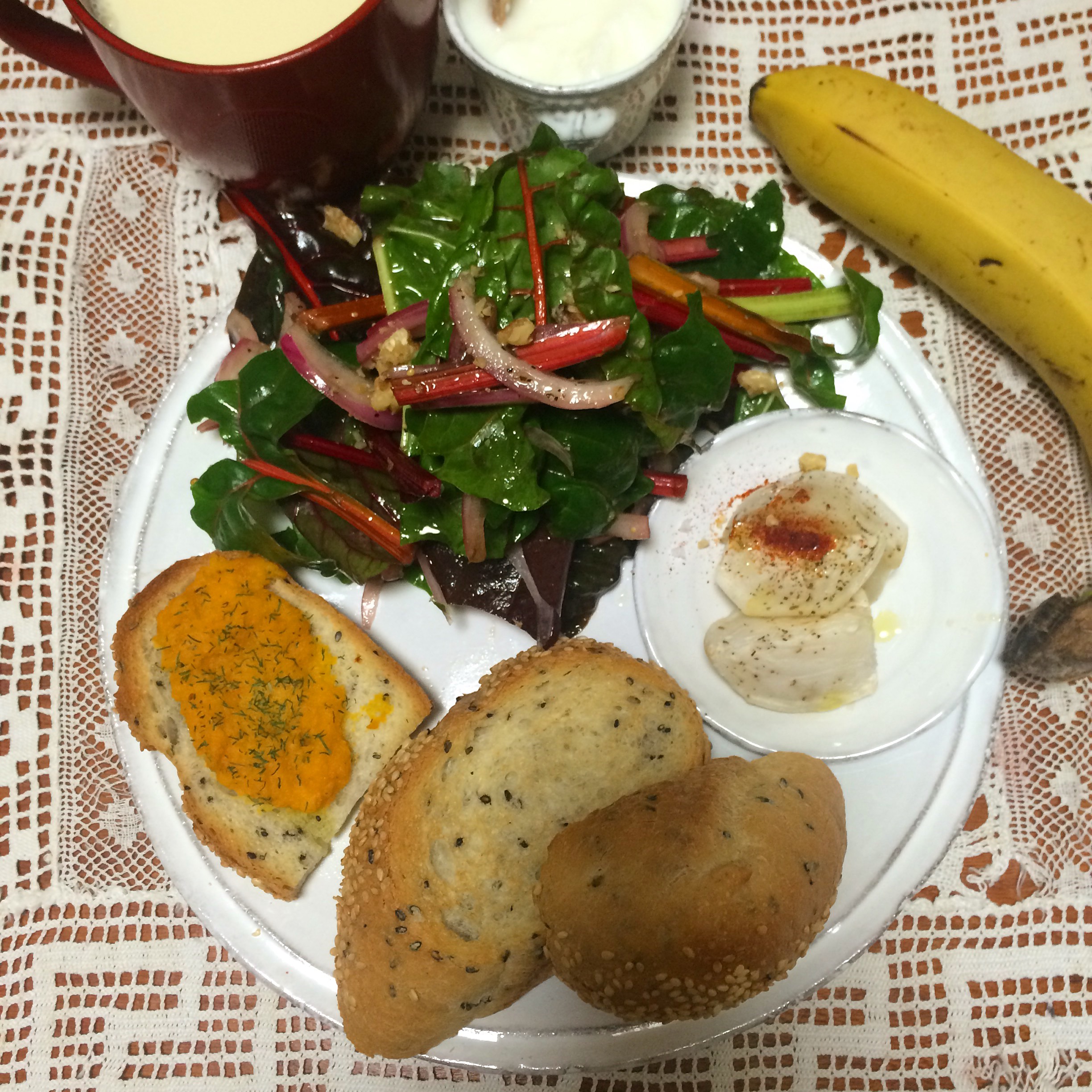 スイスチャードと紫タマネギと胡桃のバルサミコのサラダと人参クミンのタルティーヌとカブのマリネ