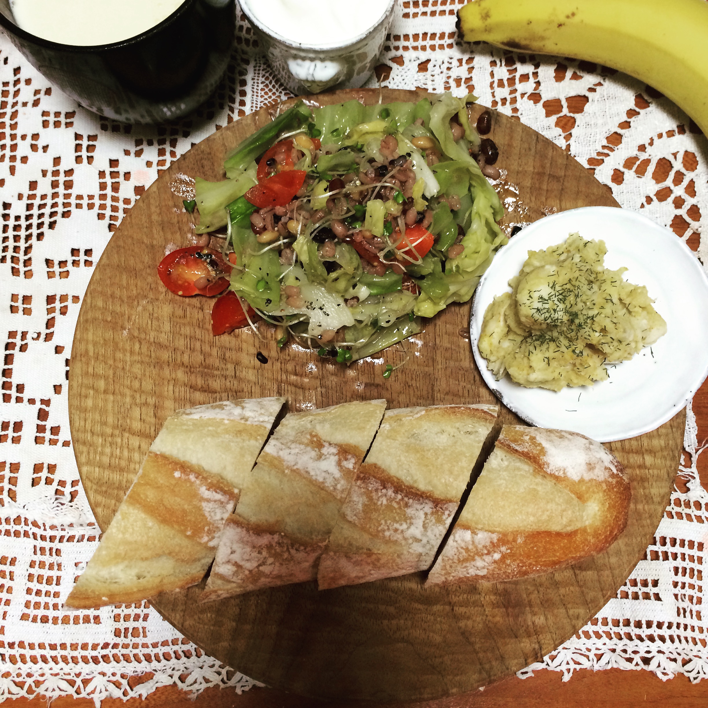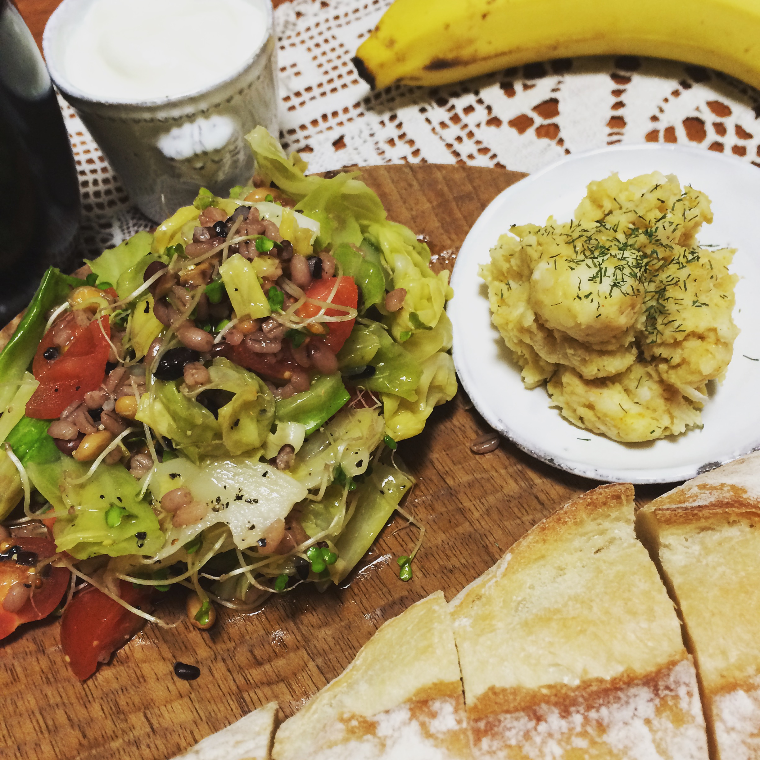 雑穀米と蒸しキャベツとスプラウトとトマトのクミンオイルのサラダと里芋のポテトサラダ