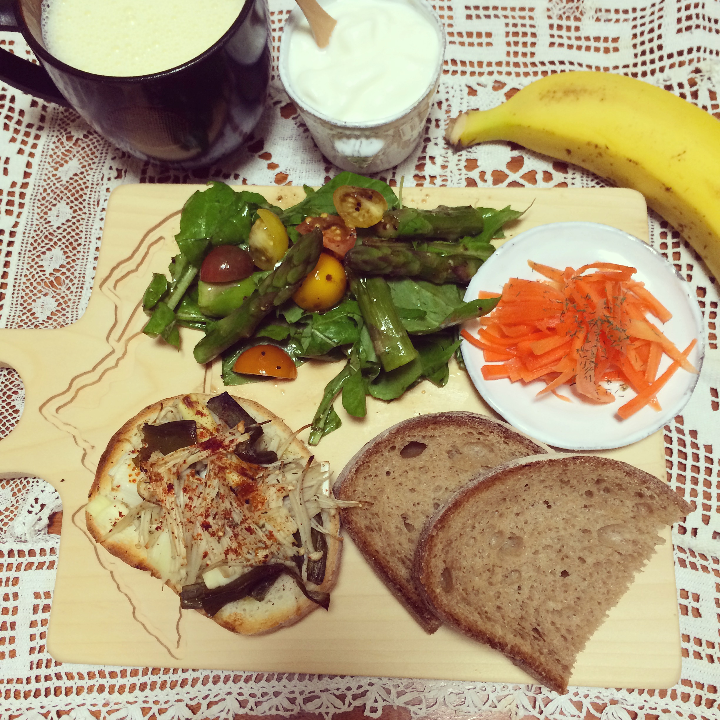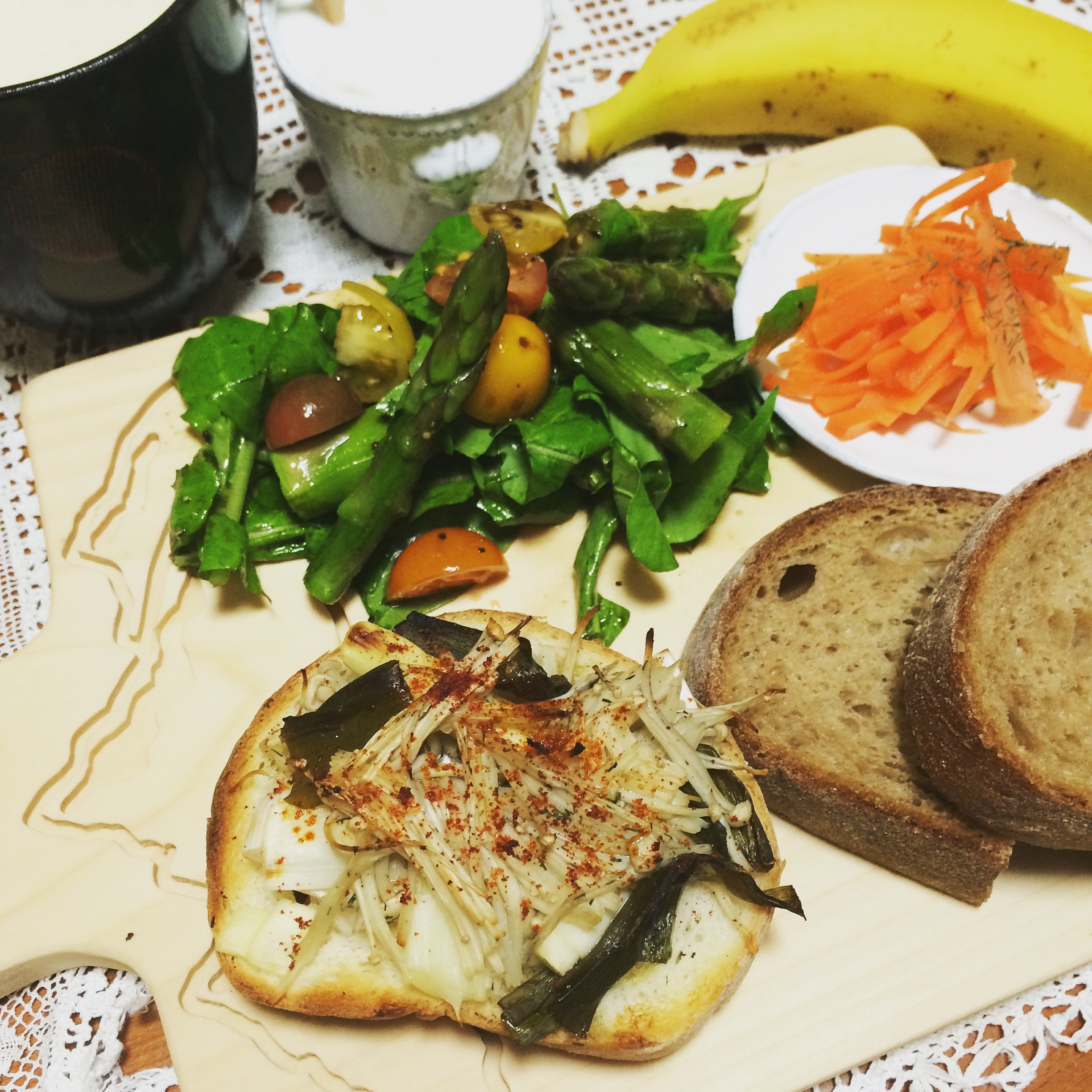 朝ごはん~アスパラとルッコラとトマトのバルサミコのサラダと長ネギとえのきのタルティーヌと人参サラダ~〜