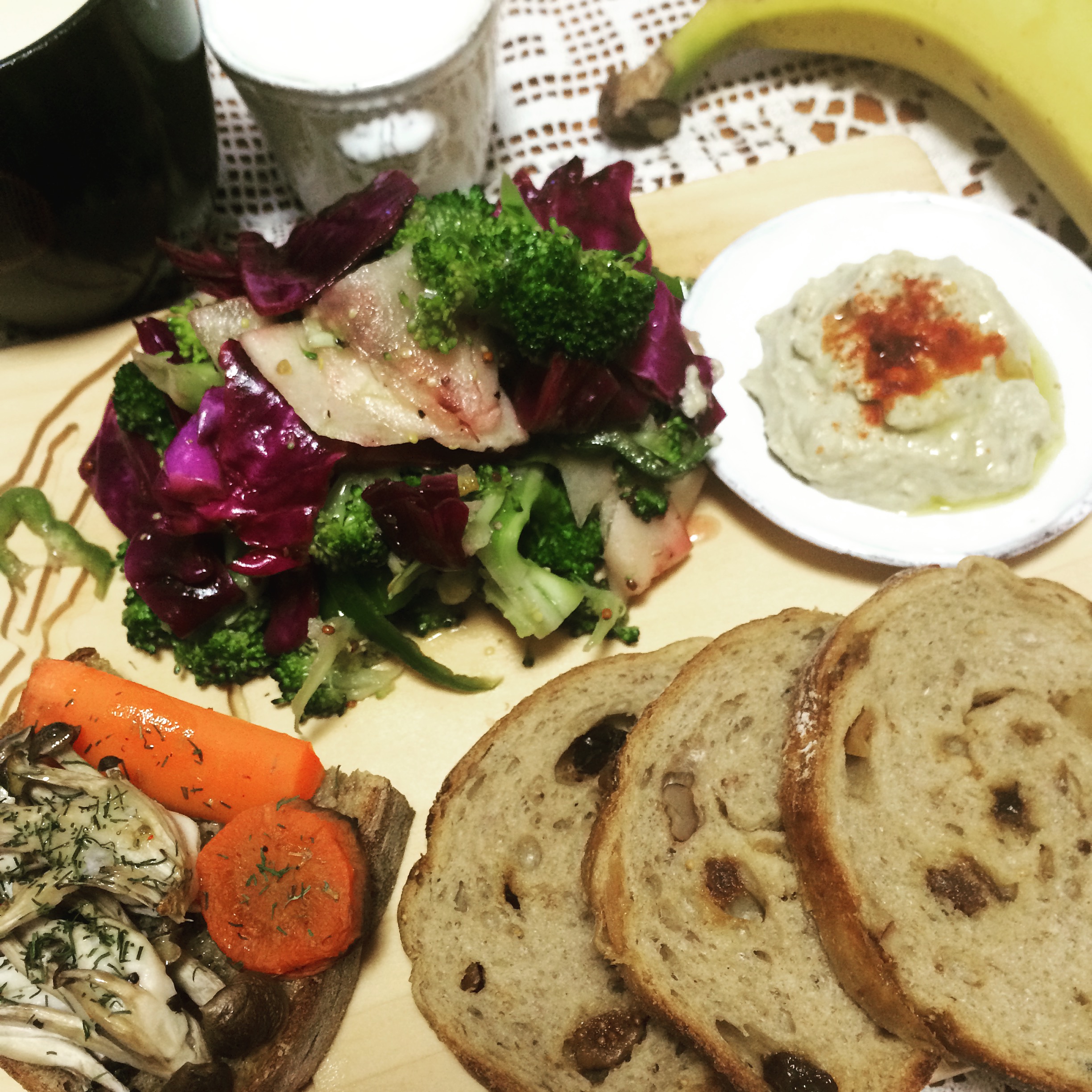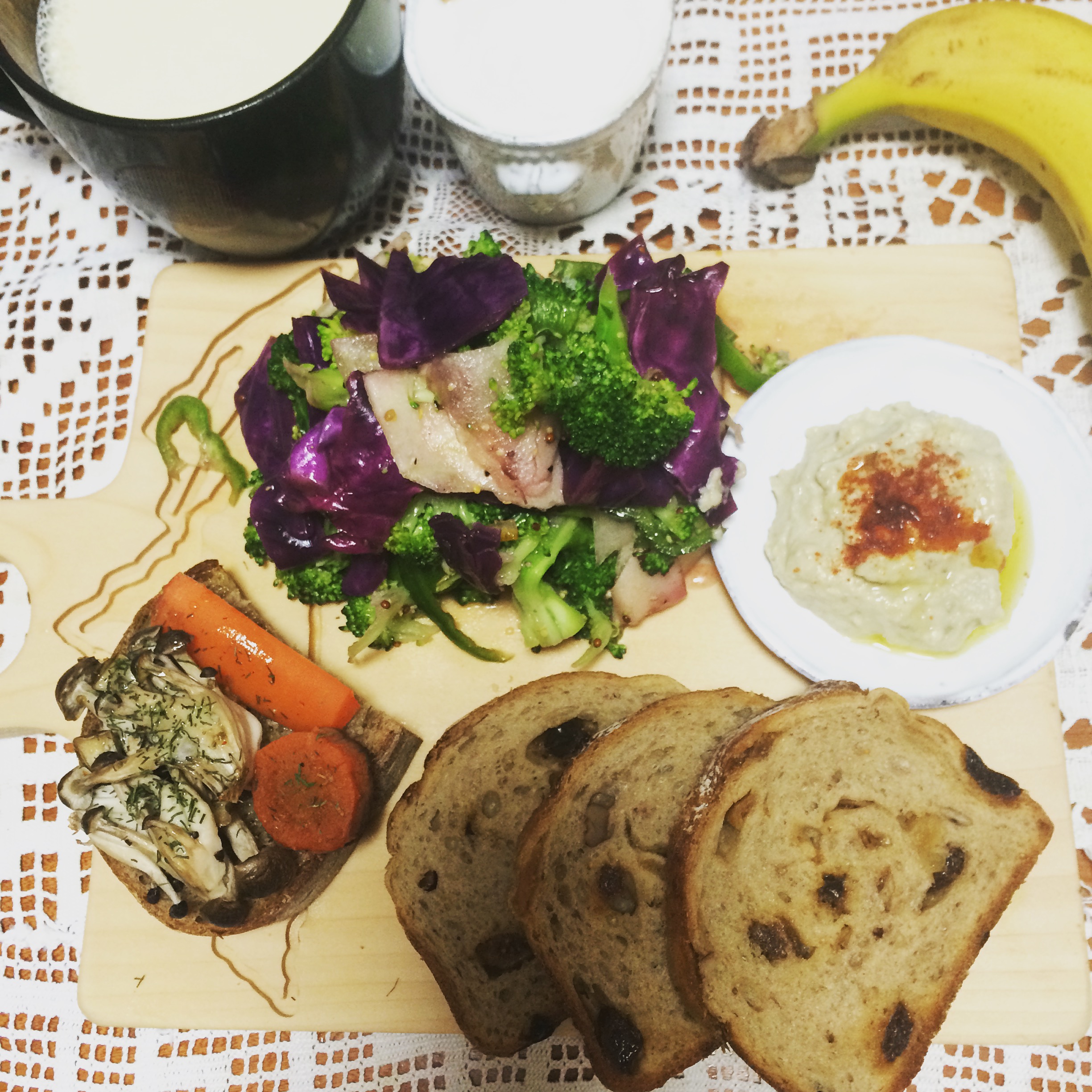 ブロッコリーと紫キャベツのマリネと玉葱のサラダとバブカヌーシュとキノコと人参のタルティーヌ~〜