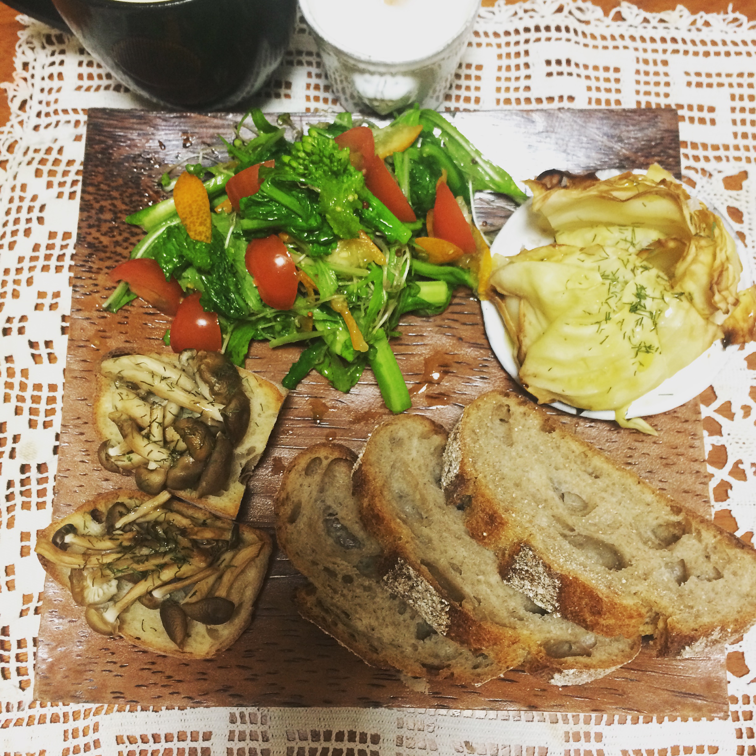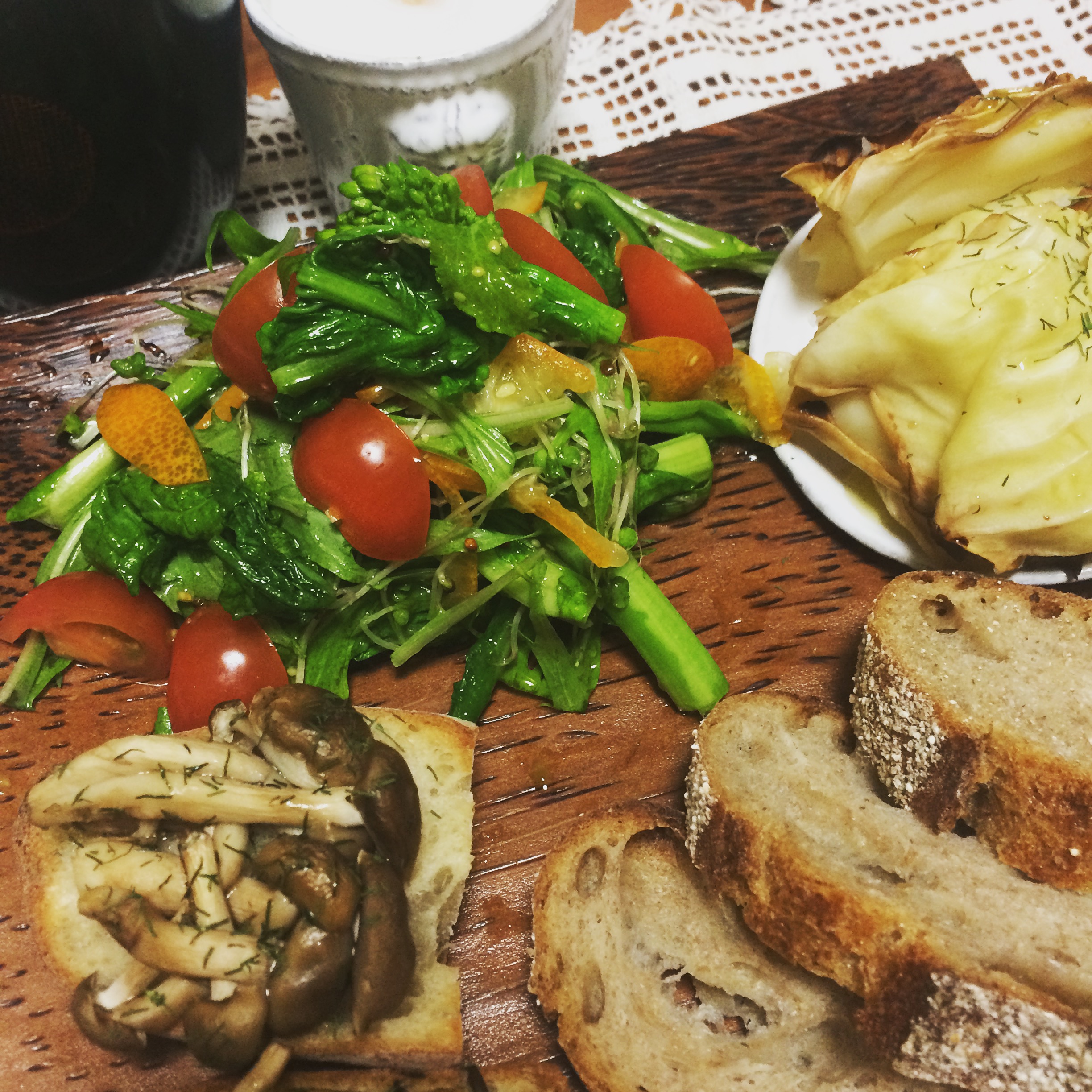キンカンと菜の花とトマトのサラダとキャベツのマリネとキノコのタルティーヌ~〜