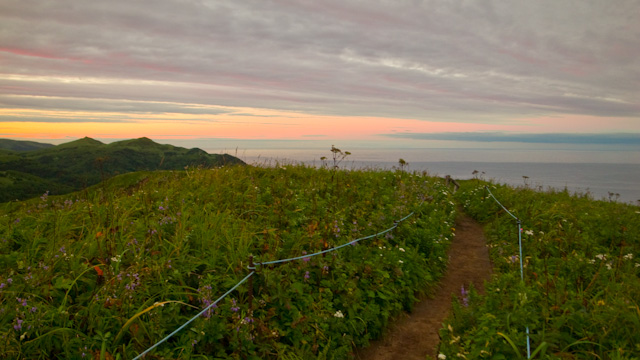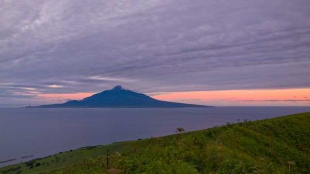 初日は夕方に到着したのでフェリーターミナルのある香深の町に宿を取り、町の裏側の桃岩展望台までの往復。高山植物の草原の先の海に浮かぶ利尻富士の眺めが何とも幻想的である。夕暮れ時の草原と海の眺めを満喫して町へ戻る。夕飯には名物のバフンウニをふんだんに使用したウニ丼を食べる。これだけでも、この島まで来て良かったと思える一品である。