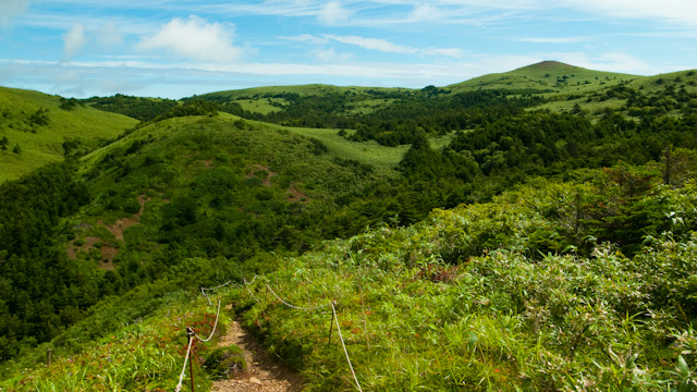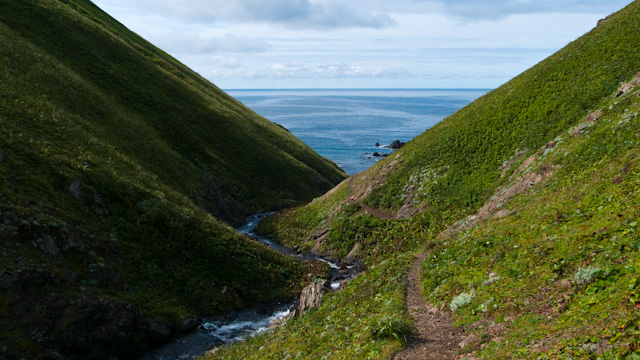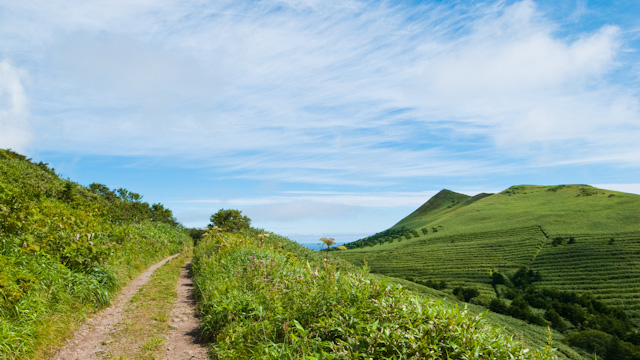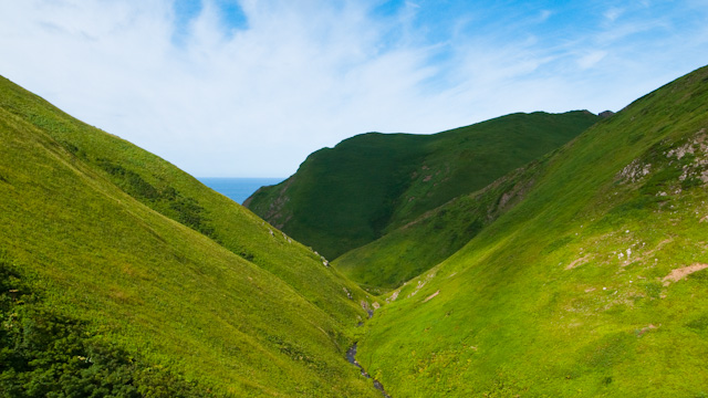 2日目は昼過ぎのフェリーに乗る必要があったため、香深井から礼文林道コースに礼文滝往復を加えた約15kmのコースに行った。礼文林道は幅も広く走りやすい。礼文滝への道は2kmほどのシングルトラックであるが、季節のせいか薮が濃くクモの巣が張り巡らされていたのが厄介だった。それでも緑の谷間の川沿いを抜け、海へと注ぐ断崖にある滝へと辿り着く道は気持ちいいトレイルであった。滝から林道までは来た道を引き返してレブンウスユキソウの群生地を通りながら香深の町へと戻る。フェリー乗り場近くに礼文温泉「うすゆきの湯」があり、トレイルでかいた汗を流して島を後にする。風呂からは利尻富士を眺める事ができる。夕方着、翌昼出発の短い時間であったが滞在を楽しむ事ができた。
