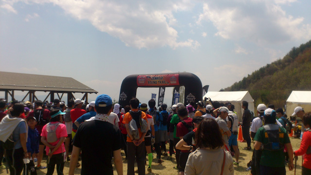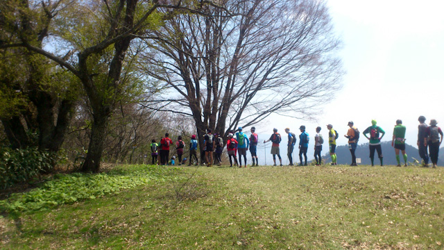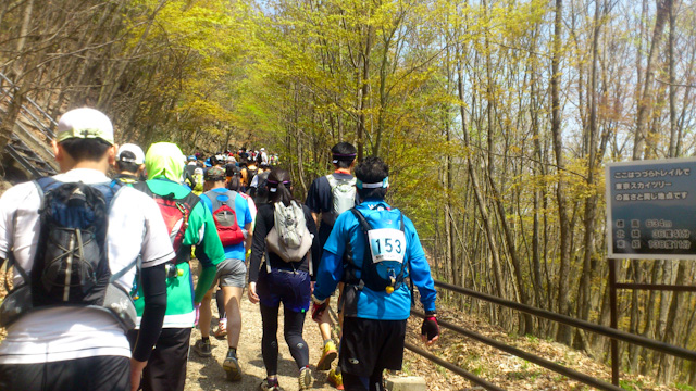スタート後は登りなのでのんびりと歩いていたらついに最後尾になってしまい、上り切る頃にスイーパーに追いつかれた。さすがに走れるトレイルが始まっているにも関わらず、歩いているというのはないので、少しずつ前の人をパスしながらようやくレースをスタート。あちこちに花が咲いており、気持ちよい春のトレイルという部分が多いコースであった。葛山にさしかかる直前で折り返してきたトップ集団とすれ違う。ここに来て、ようやく前後の距離もばらけかけていたが、滑落注意ポイントがあったようで大渋滞にはまる。最後尾組も渋滞に追いついて来たようで、ここまで走った分がすっかり帳消しになった。