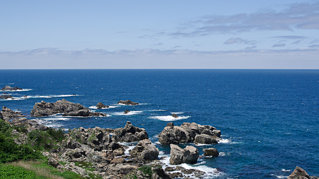 五能線で最も日本海が美しく見えるポイント。景色を見せるために列車は徐行する。この景色の駅間だけ観光バスから列車に乗り換える団体ツアー客もいた。