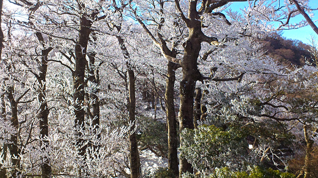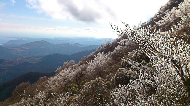 万二郎岳に辿り着くとここからは天城縦走路でよく踏まれているコースなので格段に進みやすくなる。残雪がそれなりにあったが、シューズでも特に危険な箇所はなかった。頂上からの下り坂で万三郎岳方面を眺めると山の片側に白い樹氷が吉野の山の桜を思わせるかのような、まさに雪桜とでも呼ぶべき風景をつくっていた。風が吹いて雪が風花として舞う様子は桜が散る様子にも似ている。伊豆半島最高峰の万三郎岳を通りつつ、どこで時間がかかってしまったのか、八丁池に着いたときには既に17時近くなっていた。ここから天城峠までのトレイルも気持ちいいが時間もないので、林道で下ることにする。国道に出ると既にバスがない時間だったのでとりあず河津七滝まで走る。七滝の名物ループ橋は見た目に反して1kmの距離があるようで、ぐるぐると下っている最中に真下を河津行きのバスが通過していった。次に乗ればいいやと思っていたらまさかの最終バスだった。
