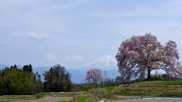 まず午前の部としては新府駅まで行き、近くの桃畑で満開の桃の花を眺め、新府城跡を通りながら、わに塚の桜を経由して韮崎駅へ。ちょうど10kmほどの距離になる。新府城跡でお祭りをやっていたり、わに塚の桜も観光客でかなり賑わっていた。広い中に一本佇む桜の巨木というのも風情あっていいものだ。このコースは終始前を見ると富士山、後ろを見ると八ヶ岳、そして桃や桜が満開という景色だった。
