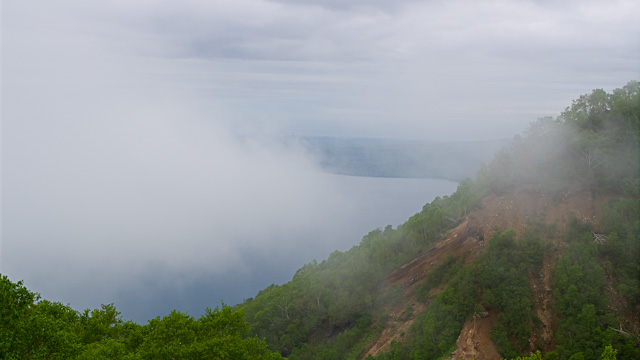 下山を決めた時に雲の切れ間から一瞬見えた支笏湖。晴れてれば壮大な景色が広がっているようだが。。。