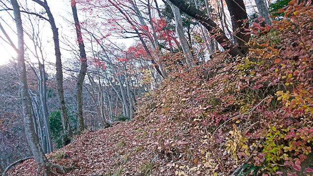 丹沢山から先もルートの1/3くらいには積雪があり、しかも凍っている部分もあったのでスノースパイクを装着して進む事にした。積雪のある部分と融けた部分が交互に繰り返す状況でその都度着脱をできるものでもないので、標高が下がり雪がほぼなくなるまでは装着した。三峰というだけあってどのピークも巻かずにしっかりと頂上を通るためアップダウンがかなりある。三峰の最後となる本間の頭から急坂を下っていくと南の巻き道を通る部分が出てくる。ここまでの雪があって風も吹いている冬のトレイルから雰囲気は打って変わる。落葉した森に日が差し込む秋のトレイルという感じで、別の季節になったかのようである。それでも、雪が残った下りの木段は非常に滑りやすく、しかも場所によっては切れ落ちた崖なので気を使ったが。途中からゴールの宮ヶ瀬湖が視界に見えてくるともうひと頑張りという気持ちになる。
