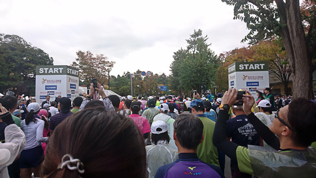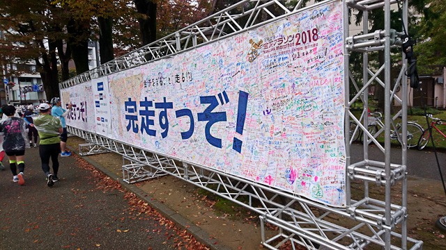 東京マラソンと比較しても沿道の応援はそれほど途切れない。人数こそ東京よりはるかに少ないが、随所にいた太鼓を鳴らして踊って応援するチームや応援スタンドなど、熱い応援が盛り上げてくれていた。特に、田んぼの間の道を通る区間が30km手前にあり、なかなか単調な風景がきついかなと思っていたが地元の方がそういう場所でも応援してくれた。