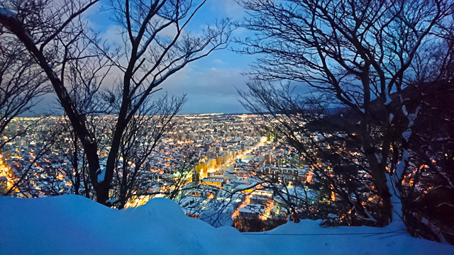 12月の中頃に既に街中も積雪している札幌へ。雪の中スニーカーで円山に登り頂上から夜景を眺める。下山時は滑りまくっておっかなびっくりだったが、まだまだ新雪であること、斜度の具合と登山口からの距離から判断して頂上まで登ることにした。雪山、夜、というなかなかしびれるシチュエーションではあったが、そんな中で山頂からの夜景は格別。最近は新3大夜景にも選ばれたらしい。