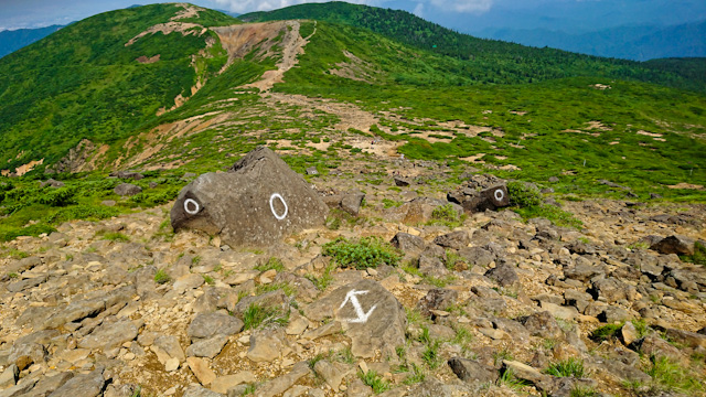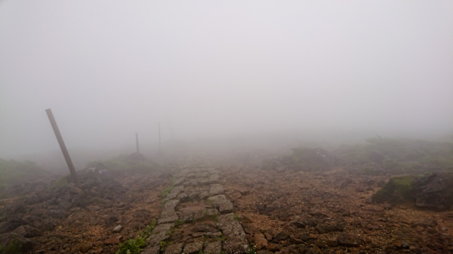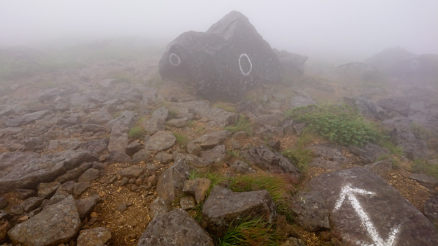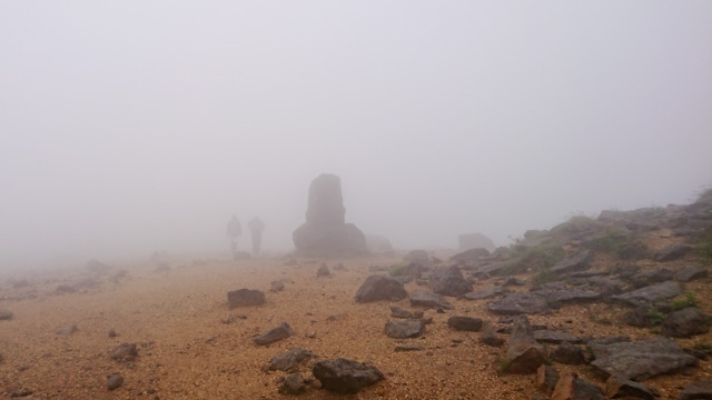晴れていれば御釜を眺められるところが視界はほとんどない。登山道を示す木の棒を頼りに風雨の中を進み、避難小屋を見つけるなり駆け込む。天候の回復を待とうとしたが、一向に天気は回復せず、白石蔵王に戻る帰りのバスに間に合わない時間になる。蔵王温泉まで行くしかなくなったので、風雨の中で山頂を通りつつ、ガレ場を矢印と○印を頼りに下っていく。足元の石が濡れて滑りやすくなっており、転けたら骨折せずとも縫うような怪我になりそうなので慎重に進む。ある高度まで下がると急に視界が開けてきて、どうやら悪天候は頂上だけだったようだ。途中カモシカに遭遇するなどしながら無事に温泉街まで下山し、硫黄の強烈な蔵王温泉で汗を流す。かなり余裕を持って下山したし、もう少し避難小屋で待っていれば頂上の天候も回復していた可能性はあった。しかし、初めて来たコースではリスクが大きいと判断した。