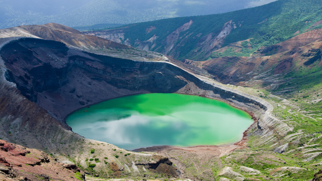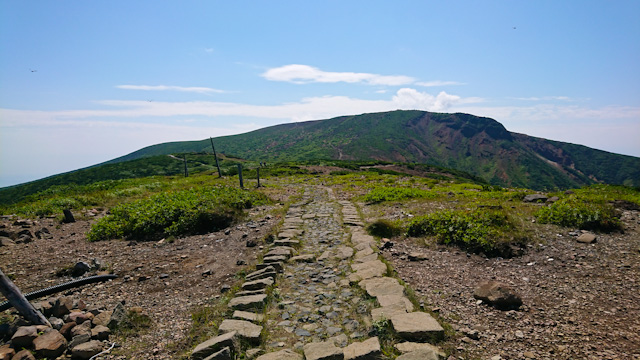 御釜を見る事を目的にやって来たのに目的を達成出来ずに終わった初日、蔵王温泉から山形駅に移動して着いた時はまだ17時過ぎでそのまま日帰りで帰る事も余裕だった。が、せっかく山形まで来たのでとりあえず一泊をして翌朝にかけることにした。前日の反省も踏まえ、まずは御釜のライブカメラをチェックし、晴れている事を確認してから蔵王温泉行きのバスに乗った。帰りの時間の制約もあるため、ロープウェイを使って地蔵岳の山頂まで移動したが、前日に通ったルートを上から眺めるのもまた趣き深い。視界がほとんどなかった前日とは打って変わって開けた景色が広がっている。前日は20人もならない程度の人としか避難小屋の中も含めコース上で出会わなかったが、この日は晴れたのでたくさんの人で賑わう。当初目的であった御釜の眺めを十分満喫することができて山頂バス停を通り過ぎて大黒天まで下った所で白石蔵王行きのバスに乗る。