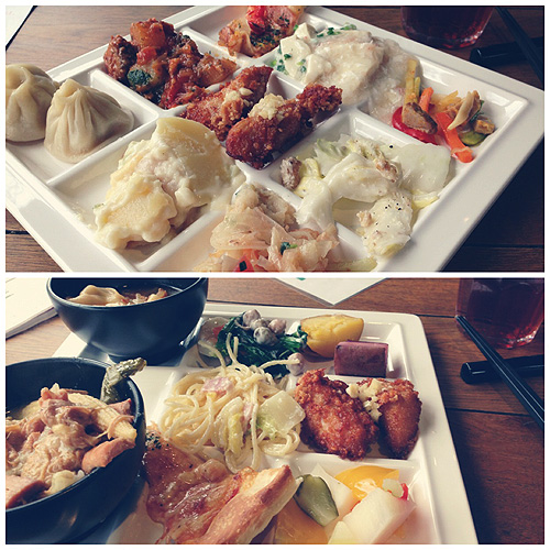 川越市場の中にある開放的なロケーション、新鮮で美味しい“とれたて食材”をオリジナリティ溢れる多彩なメニューで楽しめるビュッフェレストラン再訪。平日でも繁盛。プレート皿が9分割されているのが嬉しかったりします、大目に摂ることもなく、汁物が混ざることもなく、バランスよく♪