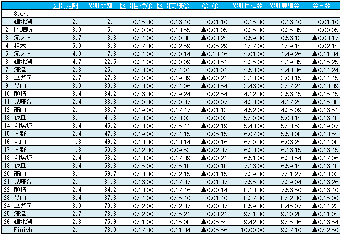 折り返し地点(丸山、49.2km)からの下りでスピードが上がらず、何十人ものランナーに抜かれた。タイム分析グラフにもこの失速が如実に表れている。明らかに後半の走力不足・スタミナ不足が課題であり、下りのスピード維持力強化がタイム短縮への鍵となる。