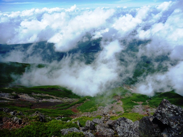 当初は小雨が降っていたが、金剛童子(標高2,475m)を過ぎた辺りから森林限界となり、視界が開ける。