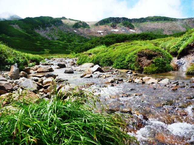 この小川の先には「まぼろしの滝」と呼ばれる、落差90mの日本最高所の滝がある。残念ながら滝そのものは上からは見えなかったが、轟音が谷間に響いていた。